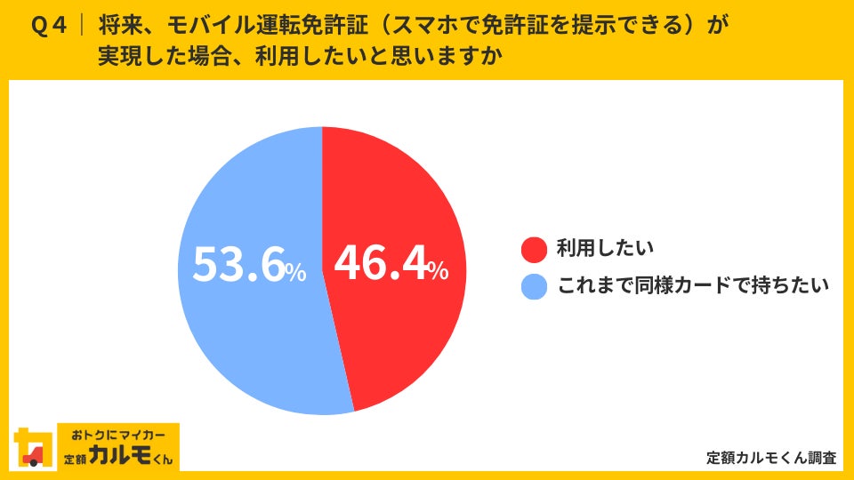 さらに、将来モバイル運転免許証が実現した際に利用したいか聞いたところ、「利用したい」が46.4%、「これまで同様カードで持ちたい」が53.6%という回答になりました。