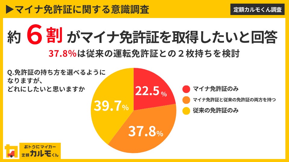 個人向けカーリースサービス「おトクにマイカー 定額カルモくん」(以下、定額カルモくん)を提供するナイル株式会社(本社:東京都品川区、代表取締役社長:高橋 飛翔)は、運転免許を持っている全国の男女1,857人を対象に、3月24日から運用が始まる「マイナ免許証」についてインターネット調査を実施しましたので、調査結果をお知らせいたします。