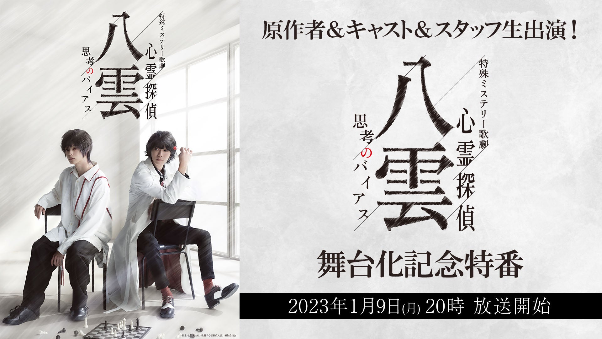 2023年3月2日(木)から21日(火・祝)まで東京・Mixalive TOKYO Theater Mixaで上演される、「特殊ミステリー歌劇『心霊探偵八雲』-思考のバイアス-」の舞台化記念として、2023年1月9日(月・祝)20時からニコニコ生放送やっぱニコメンチャンネルで特番が決定した。