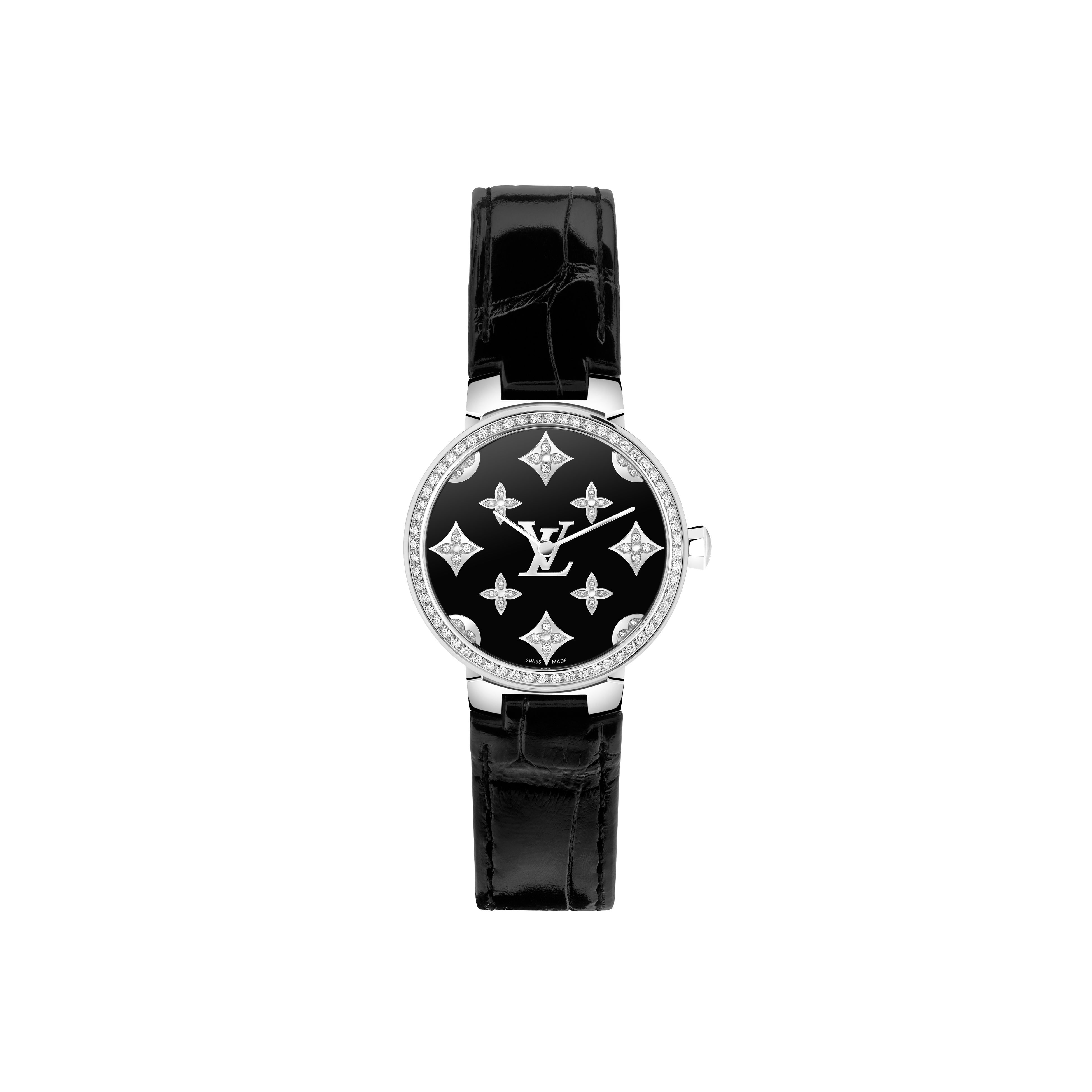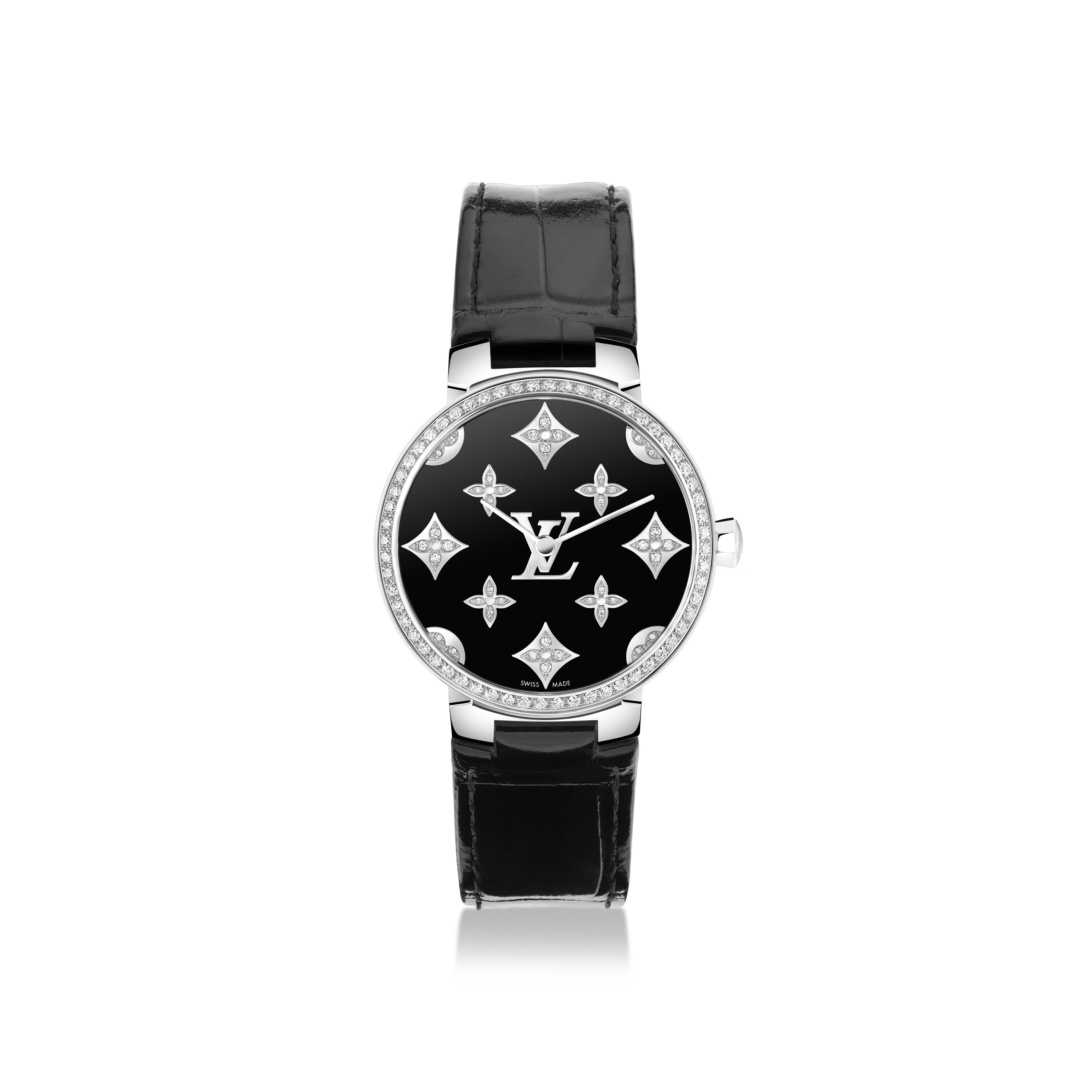 ーダイヤモンドをセッティングしたモノグラム・フラワーをあしらったブラックラッカー仕上げダイアル