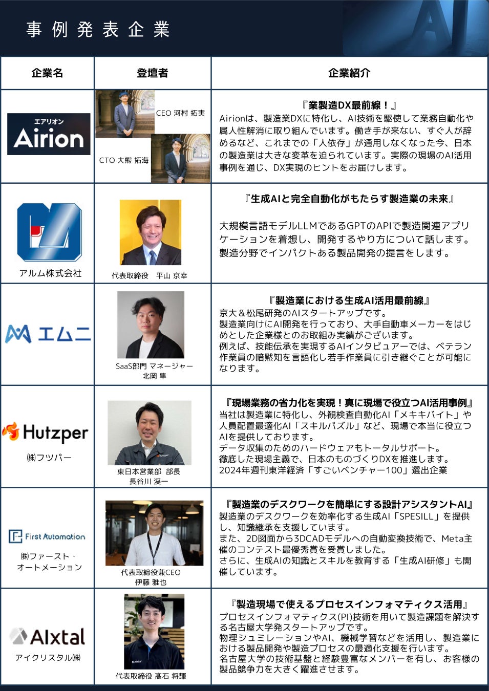 東大松尾研発スタートアップ等がAIの最新技術と具体的な応用方法を講演します。
