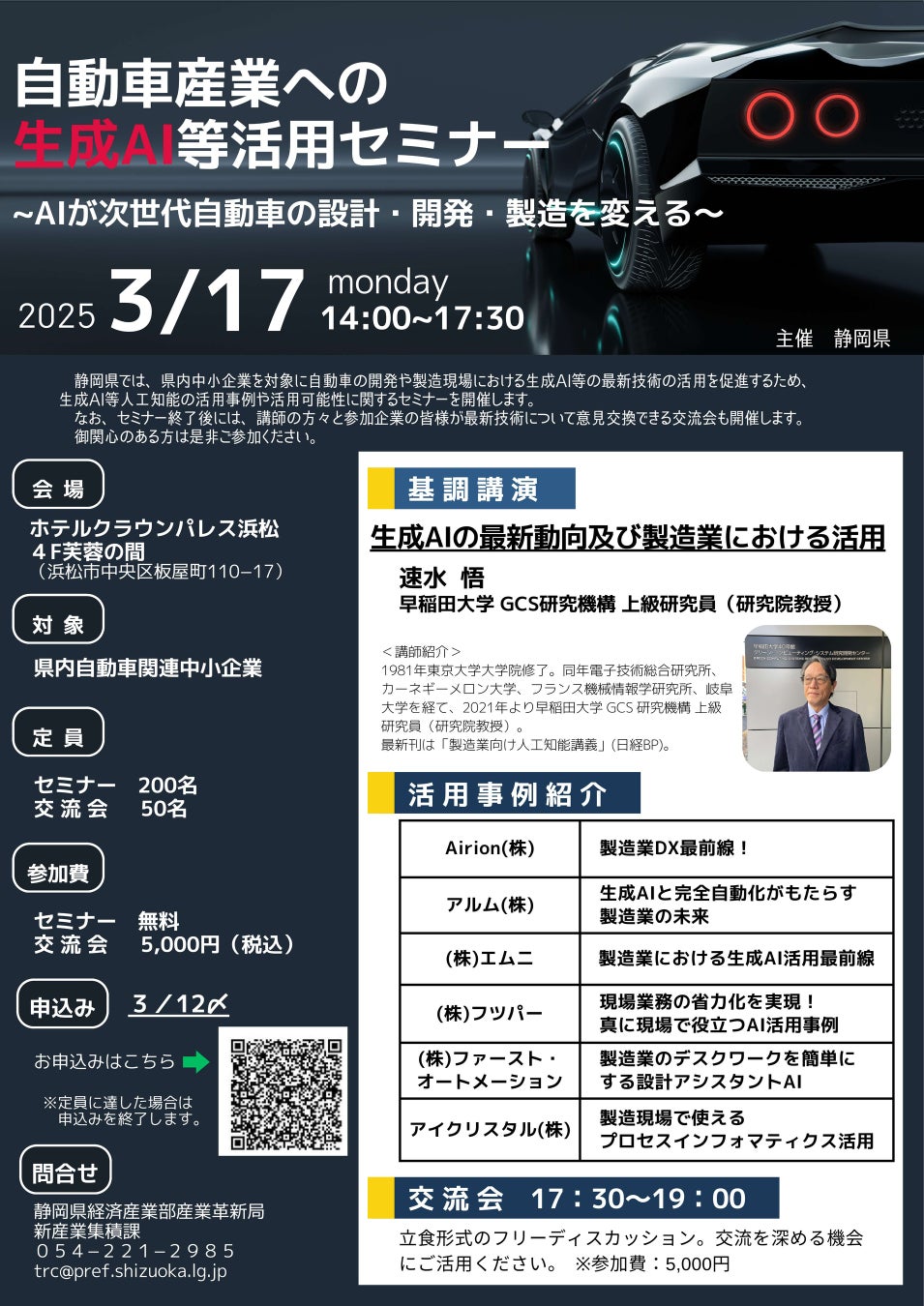 静岡県庁では、技術革新が加速する生成AI等を、自動車産業の現場に応用するため、企業向けのセミナーを企画しました。