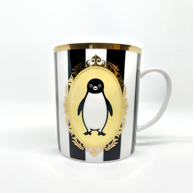 ゴールドの飾り模様がエレガントなSuicaのペンギンのマグカップ。気分が上がる、とても華やかなデザイン。