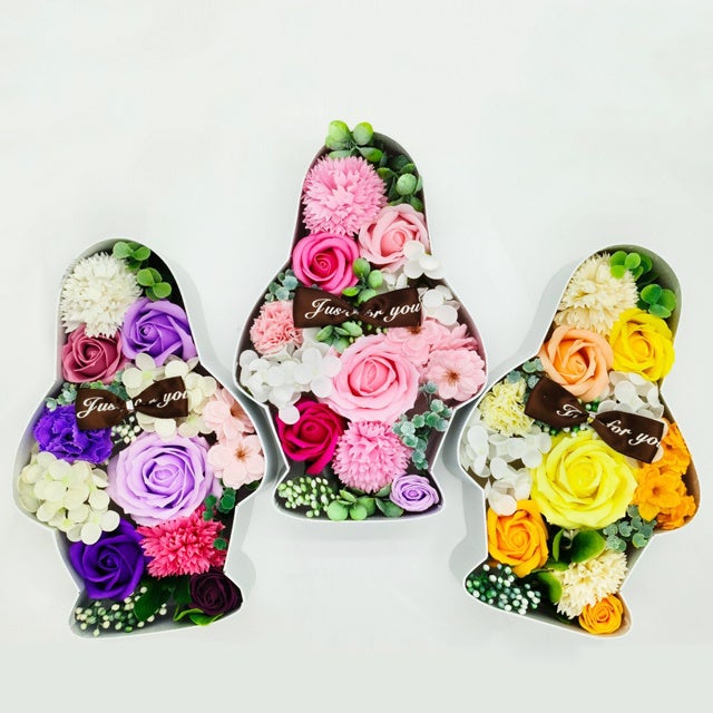 ほんのり香るソープフラワーがギフトにぴったりです。贈る方のお好みに合わせて選べる3色のカラー展開。