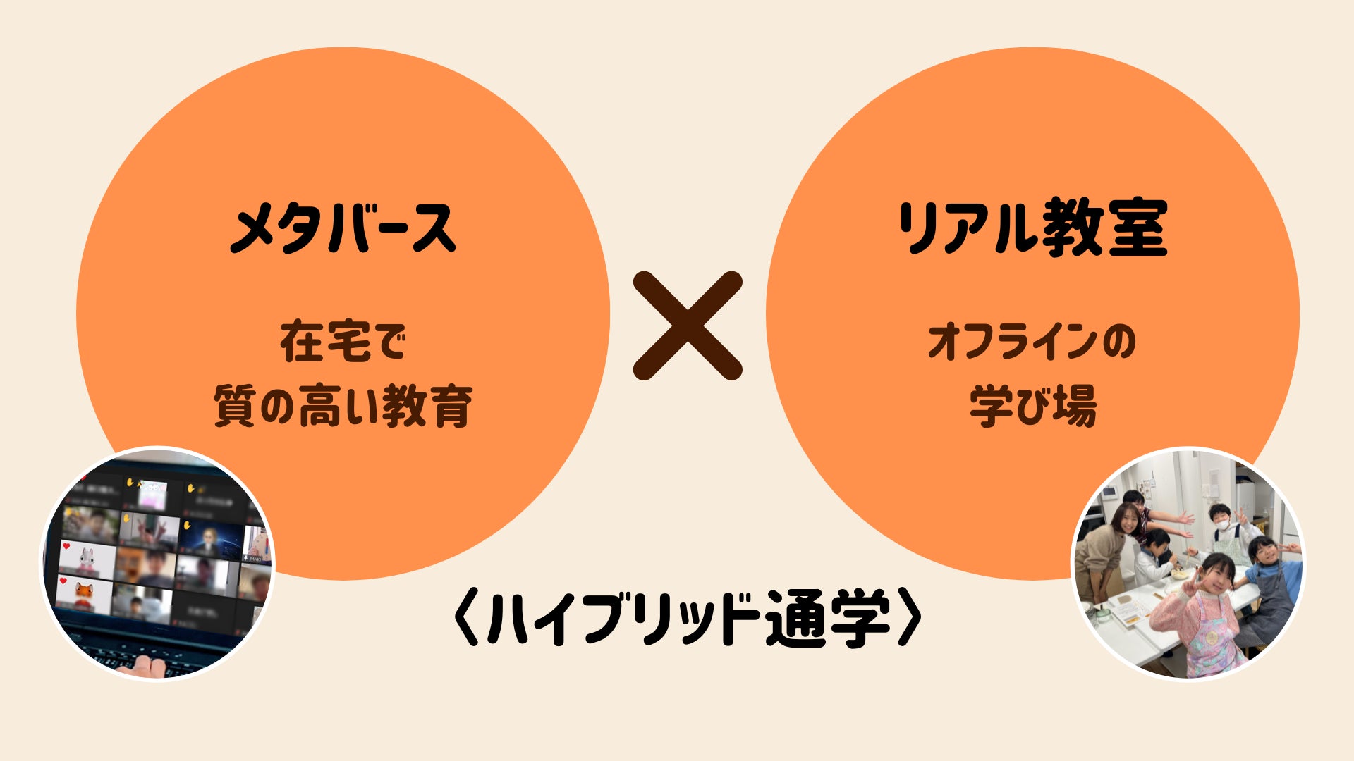 メタバース校舎で元気を取り戻した子ども達の学び場として、地域の習い事と共生をし、義務教育はメタバース校舎を利用して、興味のある部分に特化した学び方ができる『ハイブリッド通学』を全国展開しています。