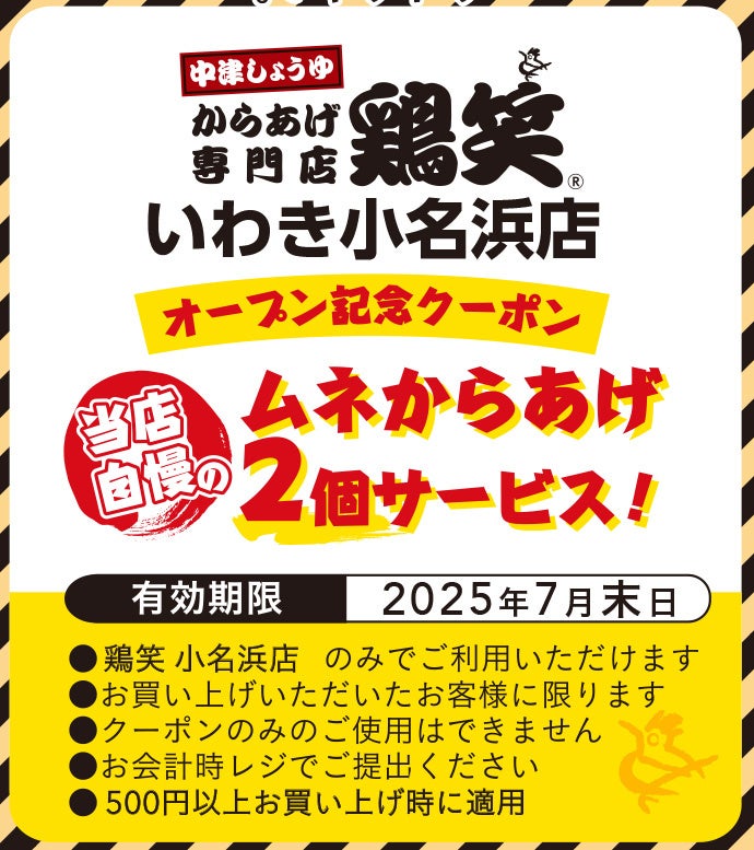 鶏笑 いわき小名浜店のオープンを記念して、 いわき小名浜店限定で「ムネからあげ2 個」がもらえるクーポン券を、数量限定で店頭などでお配りしています。以下のクーポン画像をスマートフォン等でご提示いただいても有効です。