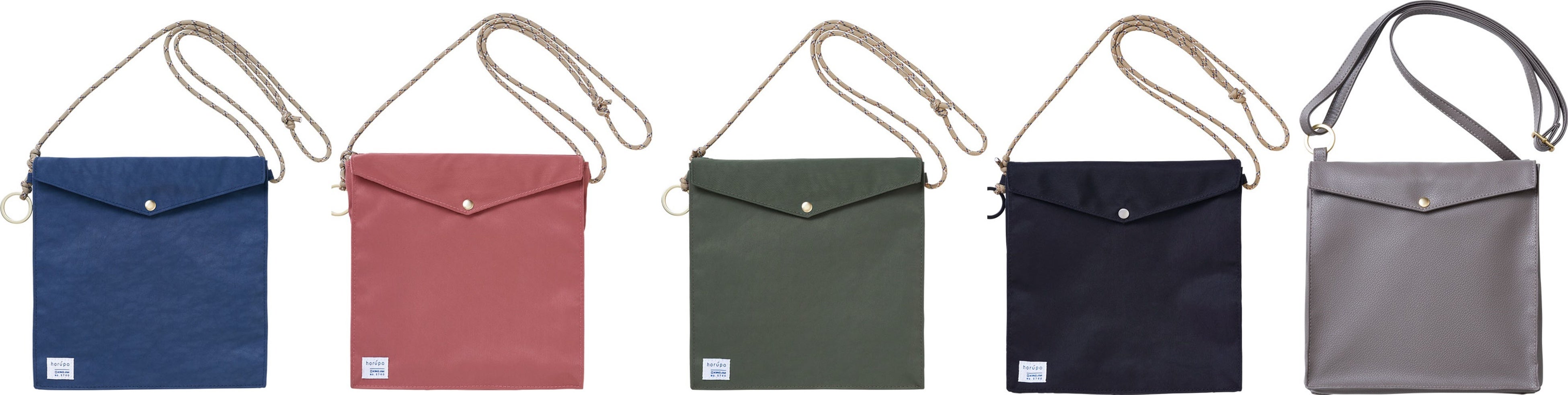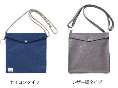 カジュアルなナイロンタイプはネイビー、ピンク、カーキ、クロの 4 色展開。シックなレザー調タイプはグレーの 1 色展開です。