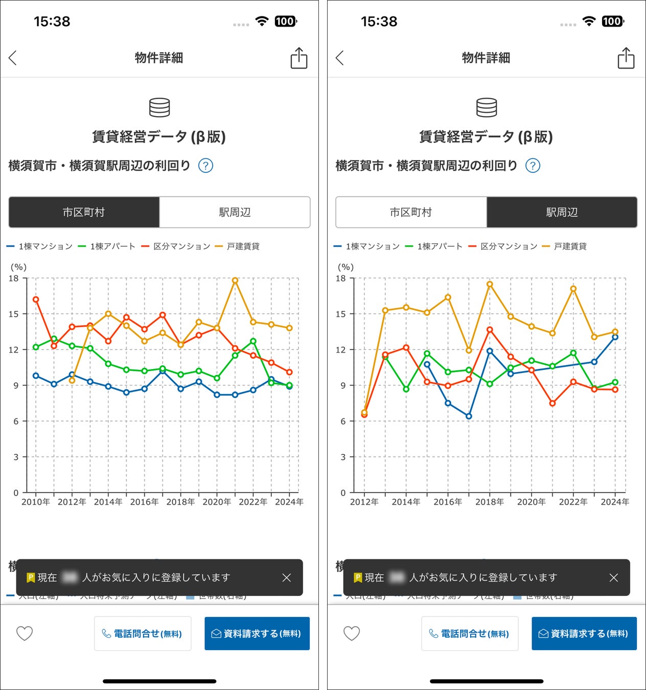 これにより、楽待アプリの物件詳細ページからは、駅別の平均利回りに加え、市区町村別の平均利回り、人口・世帯数、空室率の推移もあわせて確認できるようになっています。