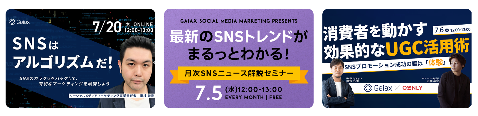 ガイアックスは、最新のSNSトレンドやSNS活用の考え方、炎上対策など、企業のマーケティング・広報担当の方々向けの無料を定期開催しています。最新のセミナー情報は以下よりご覧ください。