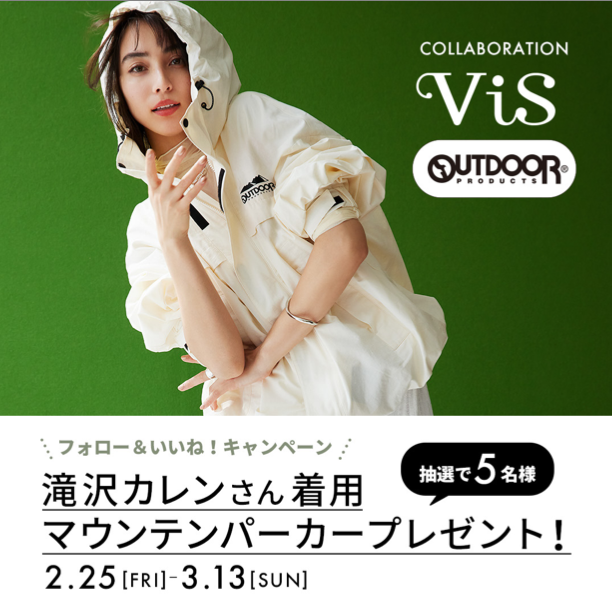 株式会社ジュン(本社:東京都港区/代表取締役社⻑:佐々⽊進)が運営する「ViS(ビス)」では滝沢カレンを着用モデルに起用した、OUTDOOR PRODUCTSとのコラボレーションアイテムを2/25(金)より販売開始いたします。