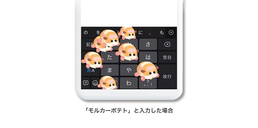 入力エフェクト機能とは、ユーザーが文字を入力し、変換候補より特定のキーワードを選択することで画像がキーボード上に現れる機能です。『PUI PUI モルカー』に登場するモルカー名を入力することで、画像がキーボード上に現れます。ワードを入力して、当コラボレーションならではのエフェクトを体験してください。