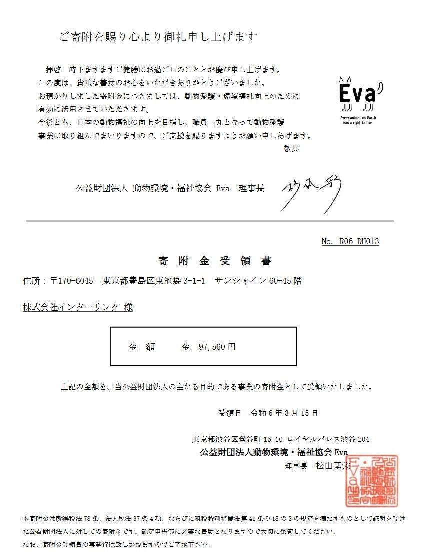 上級者向け(使う人のあまりいない)の特殊な(微妙な)サービスを提供する、インターネットサービスプロバイダーの株式会社インターリンク(東京都豊島区、代表取締役:横山正)は、社会貢献活動の一環として、杉本彩さんが理事長を務める動物愛護団体の公益財団法人動物環境・福祉協会Eva(※)へ97,560円を寄付したことをご報告いたします。