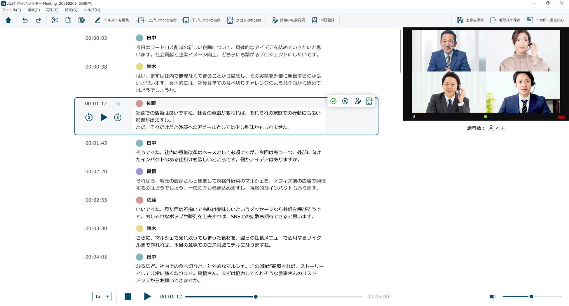 「JUSTボイスライター」は、音声からの文字起こしを支援する専用のソフトウエアです。「JUSTボイスライター」を活用することで、一太郎に搭載されている音声入力・文字起こし機能がより便利になります。これまで音声ファイルのテキスト化には再生時間と同じ時間を要していましたが、1時間の音声データなら最短10分で文字起こしが可能です。また、最大20人まで自動判別する「話者識別」機能で、議事録作成の手間を大幅に削減します。テキスト化した音声データは、文字の位置情報とタイムラインで連動しているため、確認したい部分を簡単に探し出すことができます。さらに、単語登録や一太郎への直接貼り付けなど、専門性の高い機能で、文字起こし業務を効率化します。