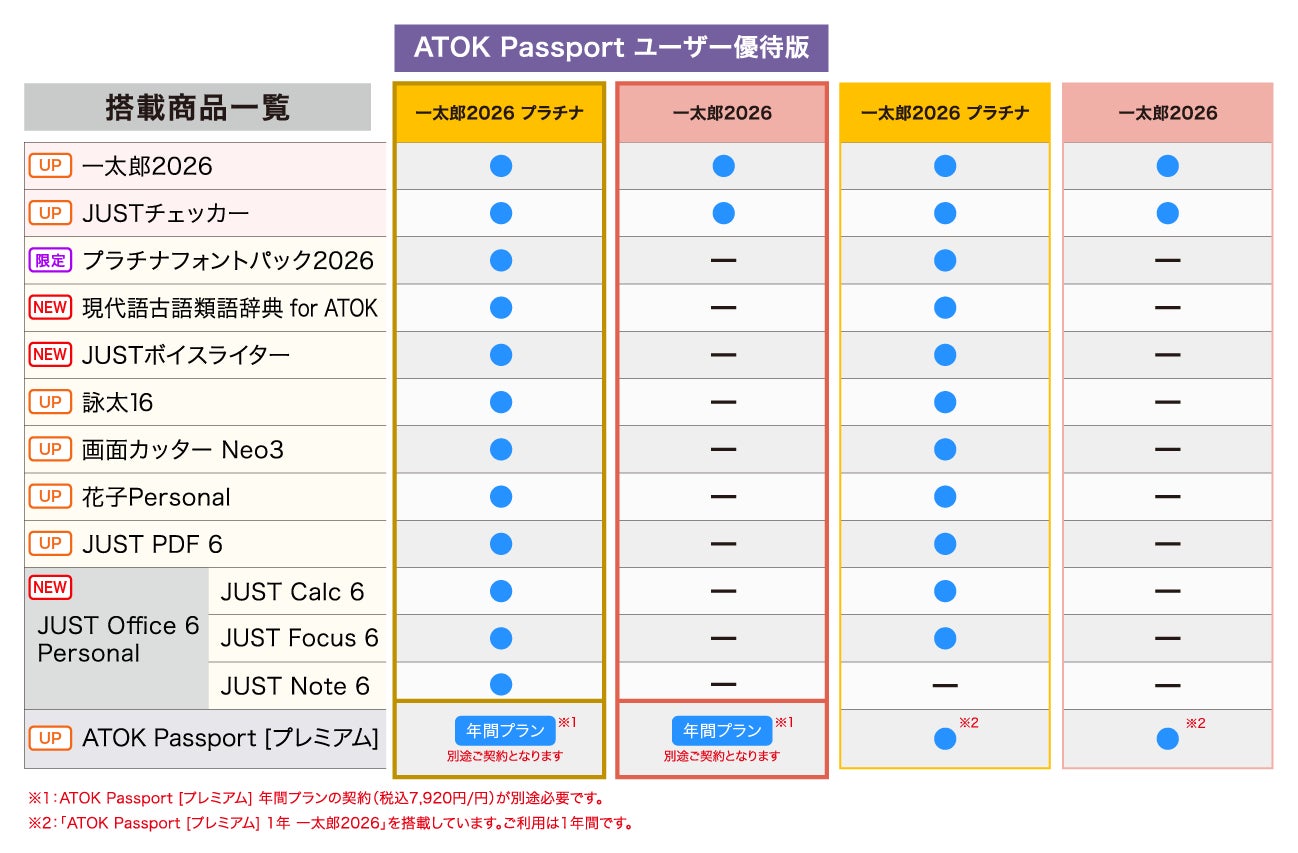 *1 一太郎/JUST Suite/一太郎&花子スペシャルパック/Justsystem Office/一太郎Office/Voice一太郎/ATOK2015~2017 for Windows(各Win&Mac、オールインワンパック含む/for Macは除く)をお持ちの方が対象です。「一太郎2026 プラチナ」は対象に花子も含みます。