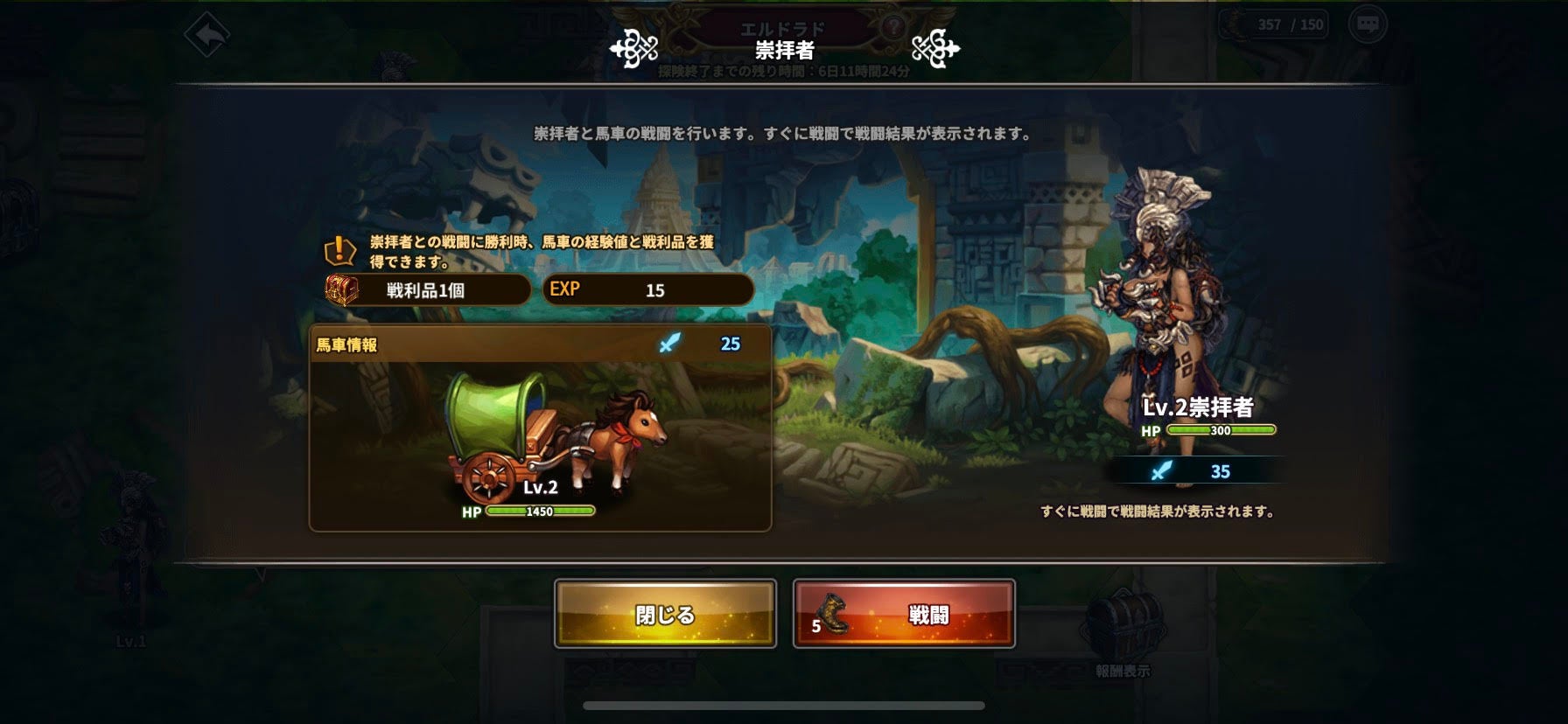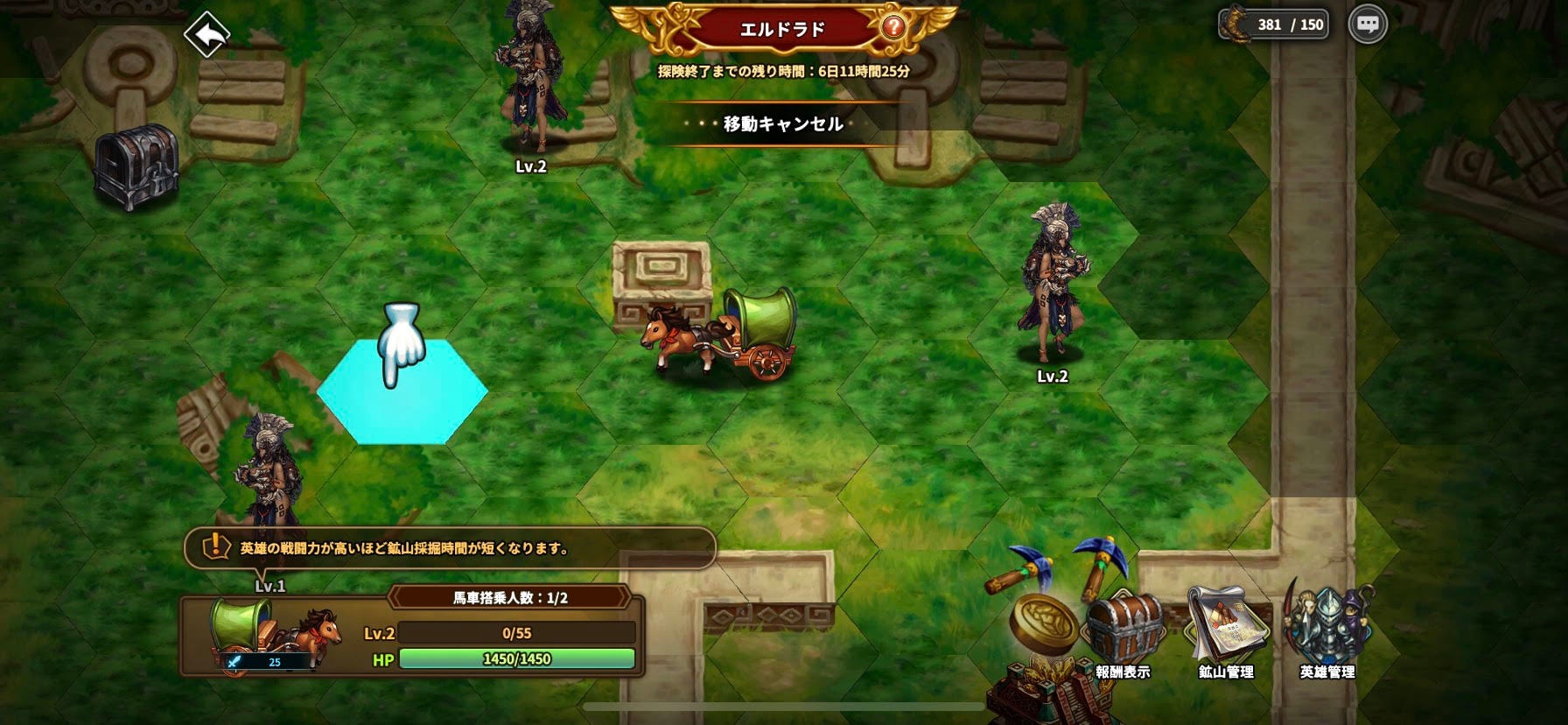 「エルドラド」では、英雄を馬車に搭乗させてマップを探検し、ルビーなどの報酬が入った宝箱を採掘できます。