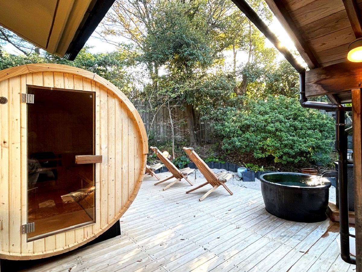 サウナ横には水風呂やチェアもあり、自然の中でゆったりと“ととのい”のひとときをお過ごしいただけます。