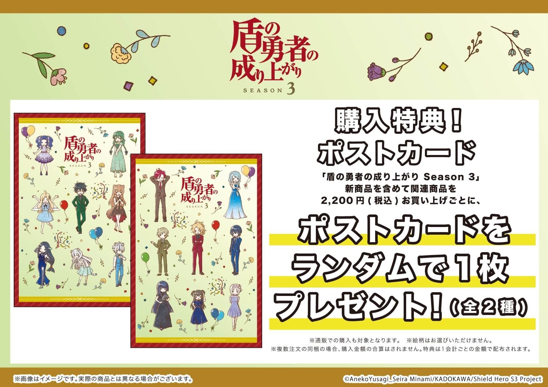 TVアニメ『盾の勇者の成り上がり Season 3』の新作グッズを含む関連商品を2,200円(税込)ご購入ごとに、ポストカード(全2種)をランダムで1枚プレゼント!