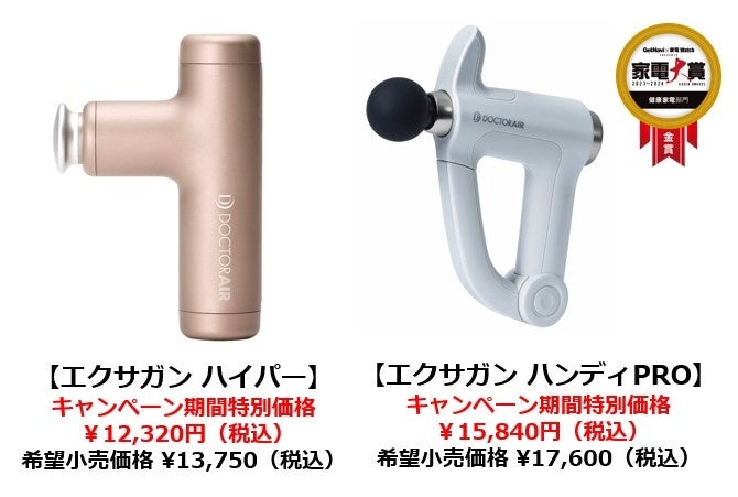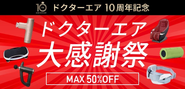 現在、『ドクターエア』では、ブランドデビュー10周年を支えてくださった皆様への感謝を込めて、 33製品*が対象の『ドクターエア10周年大感謝祭』キャンペーンを開催中です。大人気製品の【エクサガン ハイパー】をはじめ、「2023‐2024家電大賞(健康家電部門)」の金賞を受賞した【エクサガン ハンディPRO】など、母の日はもちろん、来月の父の日のギフトにぴったりな製品が最大50%OFFとなっております。ぜひこの機会にチェックしてみてください。*5/7時点