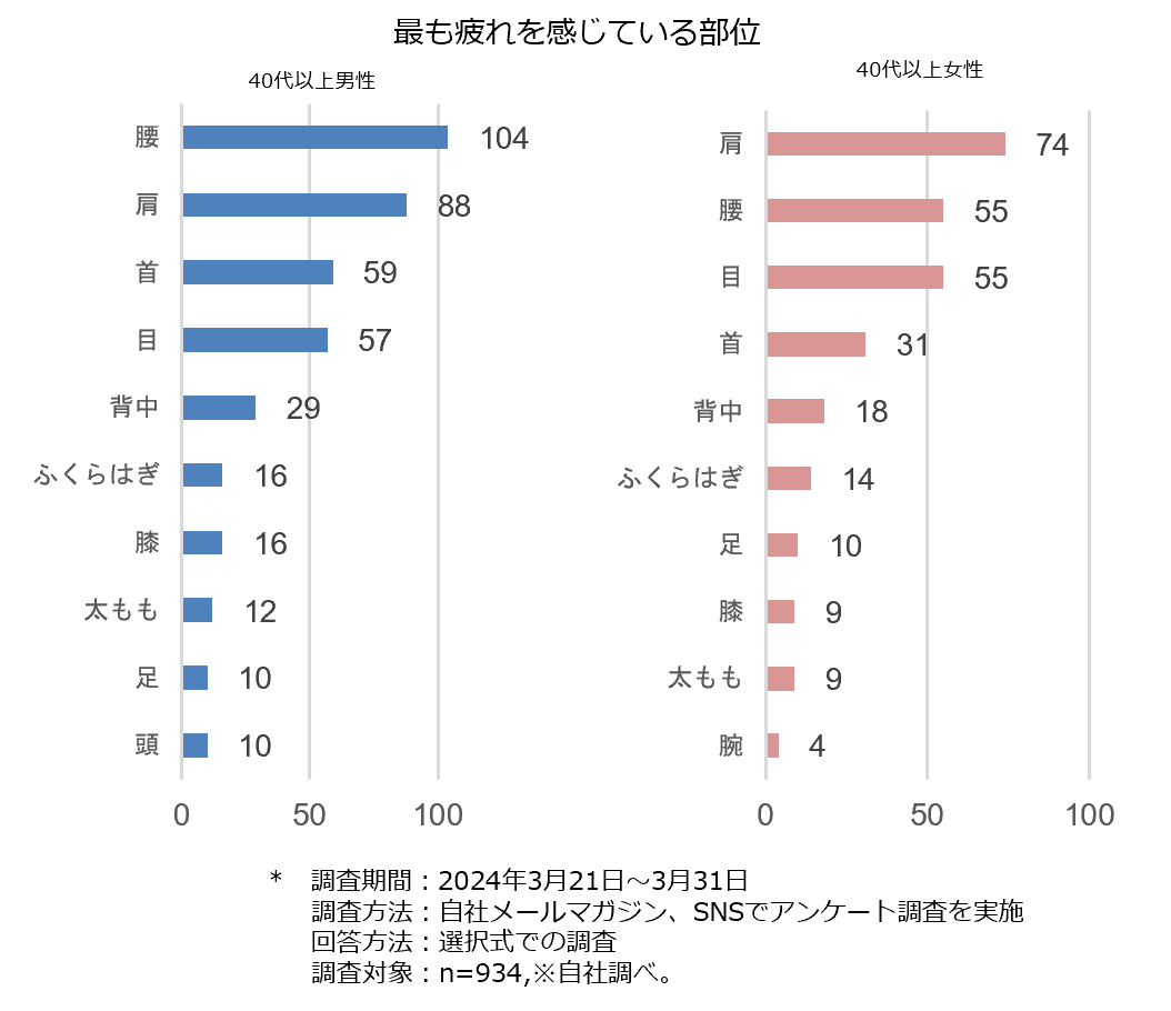 『ドクターエア』にて実施したアンケートによると、お母さん・お父さん世代(40代以上の男女)が最も疲労を感じている体の部位は、