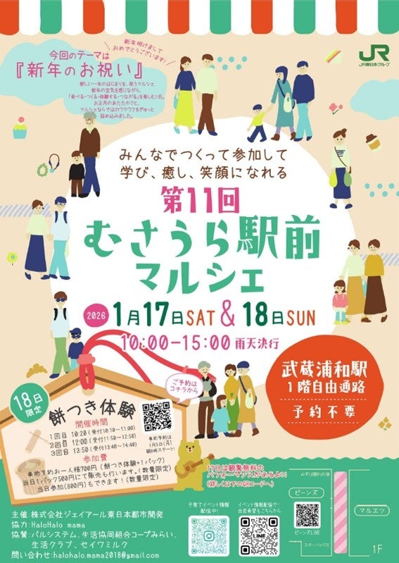 2026年1月17日(土)・18日(日)の2日間、JR武蔵浦和駅前にて地域で活動するHaloHalo mamaと連携し「第11回むさうら駅前マルシェ」を開催いたします。今回のテーマは「新年のお祝い」。前回ご好評をいただきました餅つき体験とつきたてのお餅を販売(18日(日)限定)するほか、寒さに負けない楽しいパフォーマンスやワークショップ、美味しいキッチンカーなどが集まります。家族や友人と一緒に、新年の空気を楽しむひとときをお過ごしください。みなさまのご来場をお待ちしています。