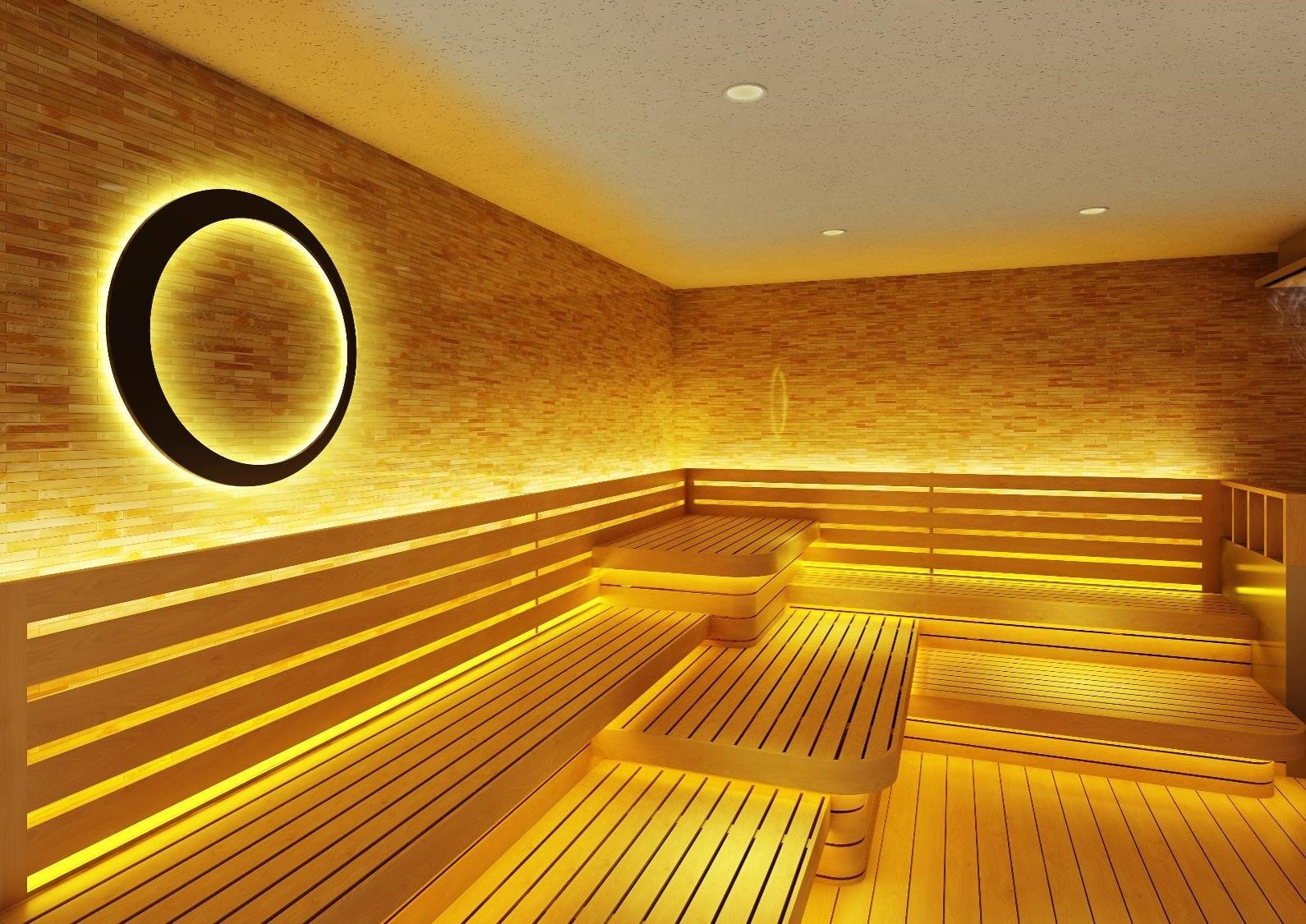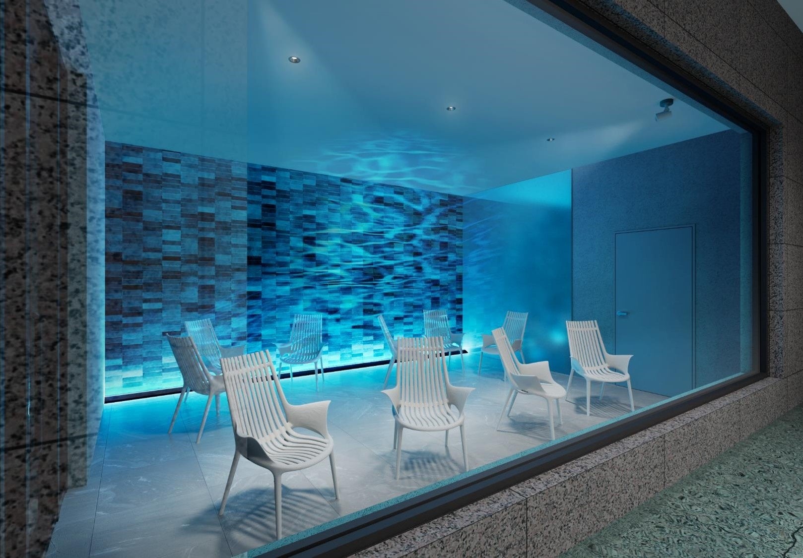 特長:視覚的にも涼しく感じられるブルーに彩られたクールルーム。水のゆらめきを表現した光が、幻想的な雰囲気を演出します。クールなアロマが香り、ホットサウナの暑さから解き放たれた解放感を感じていただけます。