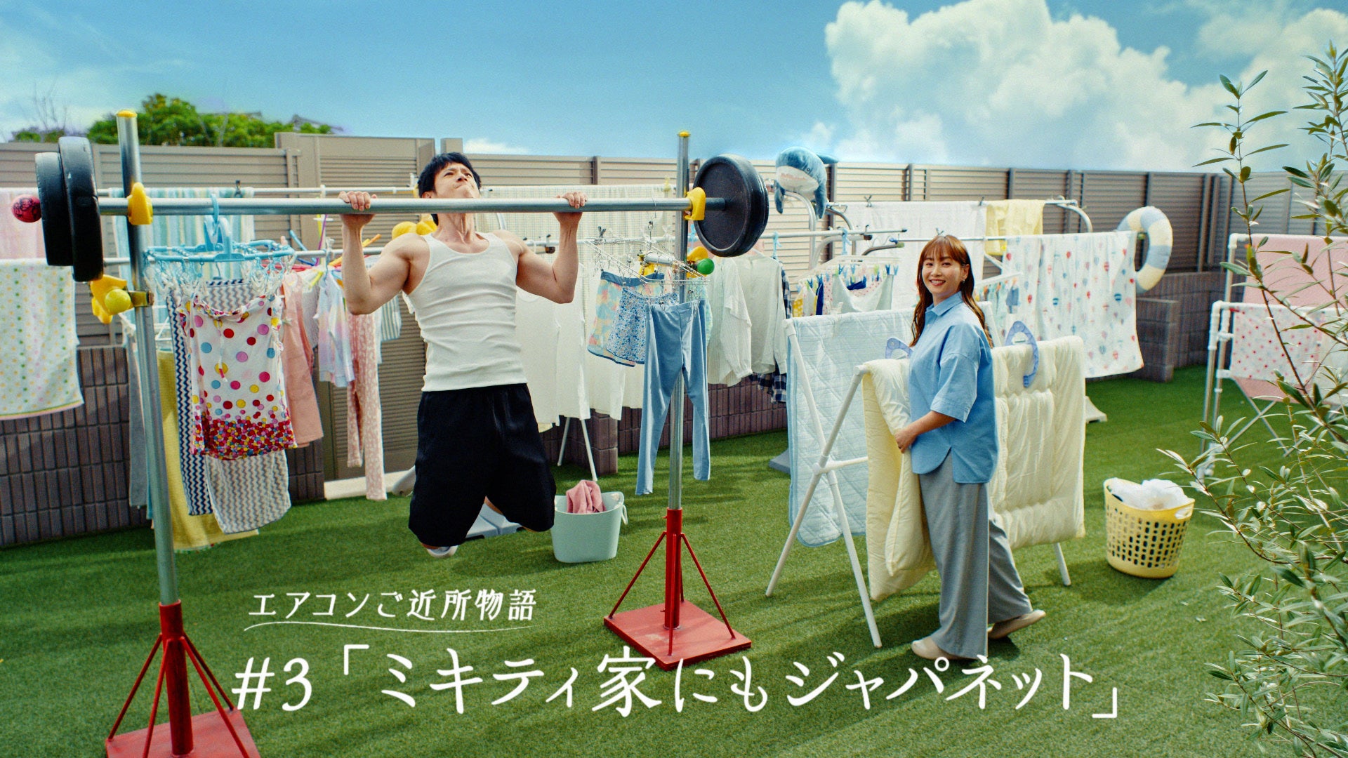 藤本さん・庄司さん夫妻のご自宅へ、ご近所の国分さんが訪問することから始まる「エアコンのおトク話」がCMのメインテーマ。結婚して16年目で、古くなったエアコンを買い替えようかと考える藤本さん・庄司さん夫妻に対して、ジャパネットのCM出演16年目になる国分さんが圧倒的な熱量でサポートするストーリー。物干し竿で懸垂をしたり、エアコンをダンベル替わりに筋トレをし始める庄司さんに、「落ち着いて!!」とピシャッと制する藤本さんの様子など、「普段の庄司家」のイメージをコミカルに表現しました。「ミキティ家に訪問」篇、「エアコン買いに行ったはずが…」篇、「ミキティ家にもジャパネット」篇、「アフタートーク」篇の4篇を放送します。