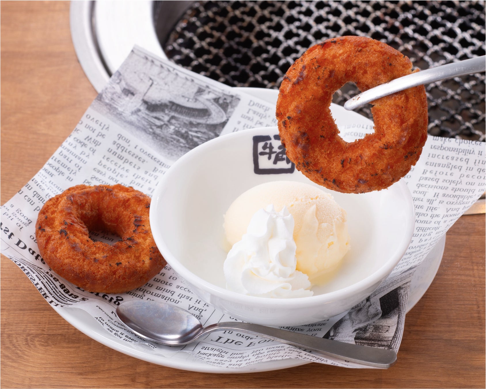 七輪で炙って香ばしく仕上げたドーナツに、冷たいアイスを重ねて味わう新感覚スイーツが登場。外は香ばしく、中はふんわり、“あたたかさと冷たさが交差する新食感”が楽しめます。