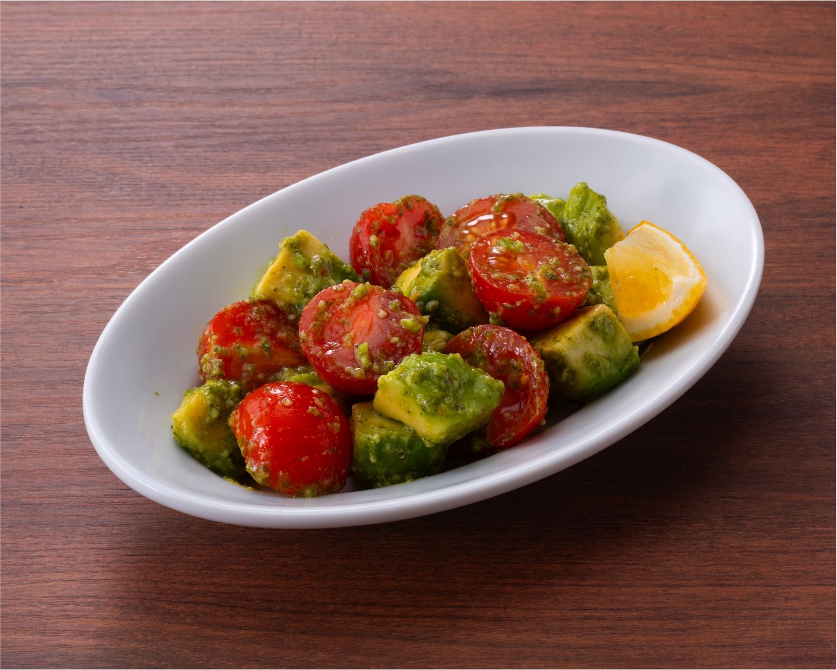 ジューシーなトマトとアボカドに、香るバジルが旨みを引き立てる“ご褒美マリネ”。付け合わせのレモンを絞って、さらにさっぱりと。