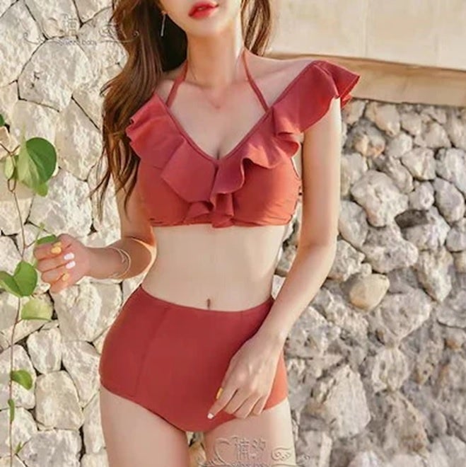 肩からVラインのフリルデザインが可愛く、オフショルでも楽しめる2way仕様。ハイウエストショーツで気になるお腹もカバー。