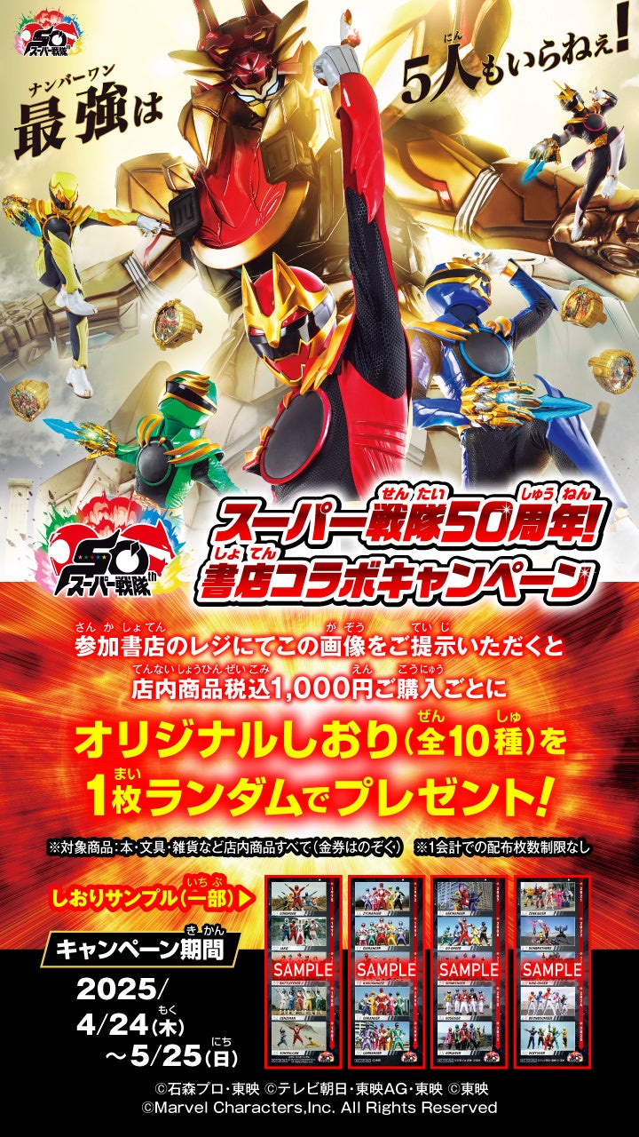 日本出版販売株式会社(代表取締役社長:富樫 建、略称:日販)は、東映株式会社(代表取締役社長:吉村 文雄)制作による「スーパー戦隊シリーズ」50周年を記念した書店コラボキャンペーンを、2025年4月24日(木)より全国568書店にて開催します。