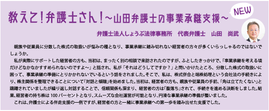 今回から初めて、弁護士による伴走支援の一例をコラムとして掲載。親族や従業員に分散した株式の取り扱いについて、弁護士法人しょうぶ法律事務所の山田尚武弁護士が事例をわかりやすくまとめてくれています。また、地域の支援機関と連携してサポートする事業承継プラットホーム「とよはし事業承継ひろば」も取り上げ、市内の支援先や相談体制についても紹介しています。