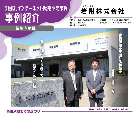 第5号では、市内でインターネット販売小売業を営む「岩附株式会社」(大村町)の親族内承継の事例を紹介しています。同社の3代目社長と後継者から、「事業を引き継ぐ上で苦労したこと」「事業承継後の新しいビジョン」などについて話を聞きました。さらに、具体的な事業承継の流れを、「どこの機関に」「いつ」相談に行ったのかをわかりやすく記しています。