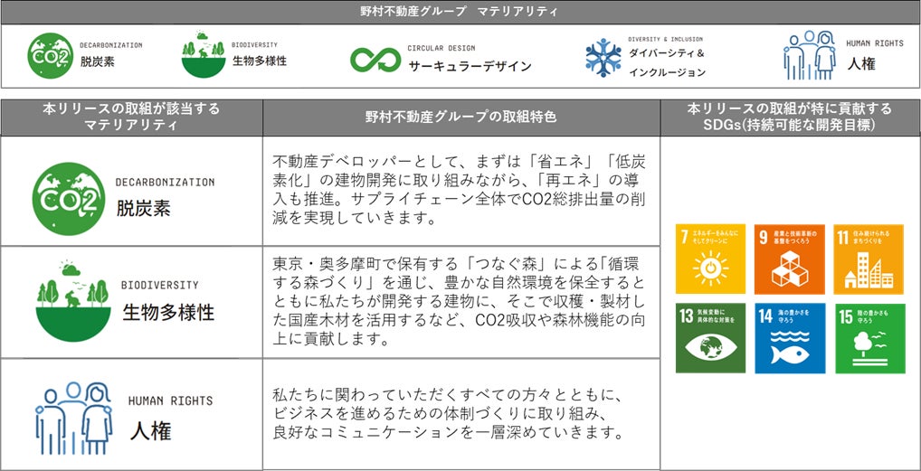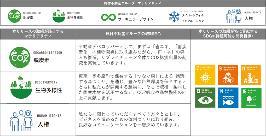 このような日本特有の課題がある中、当社グループは2030年までのマテリアリティ(重点課題)として環境面では「脱炭素」「生物多様性」「サーキュラーデザイン」を掲げており、住宅、オフィス等の開発時に国産木材をはじめとした木造・木質化を積極的に推進しています。