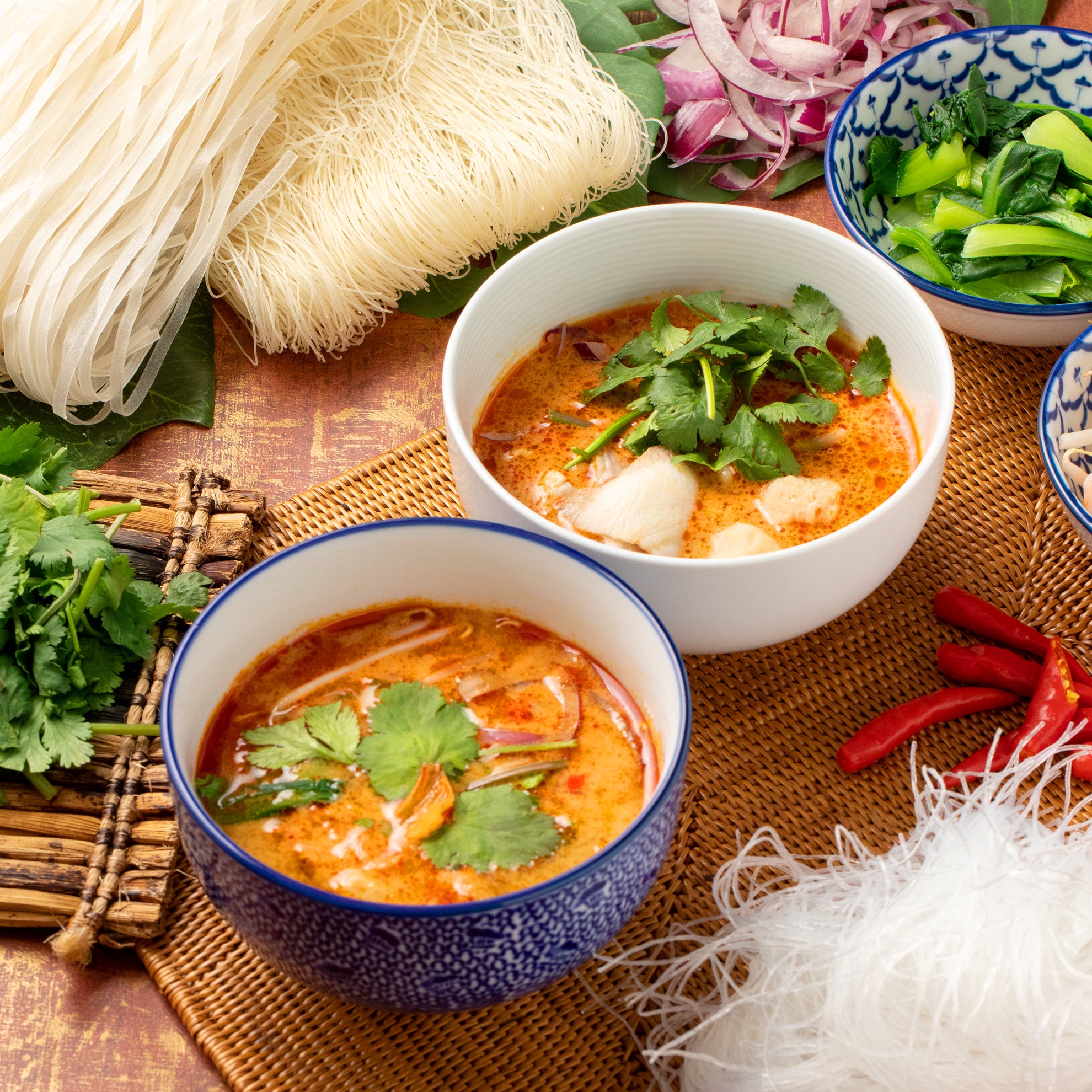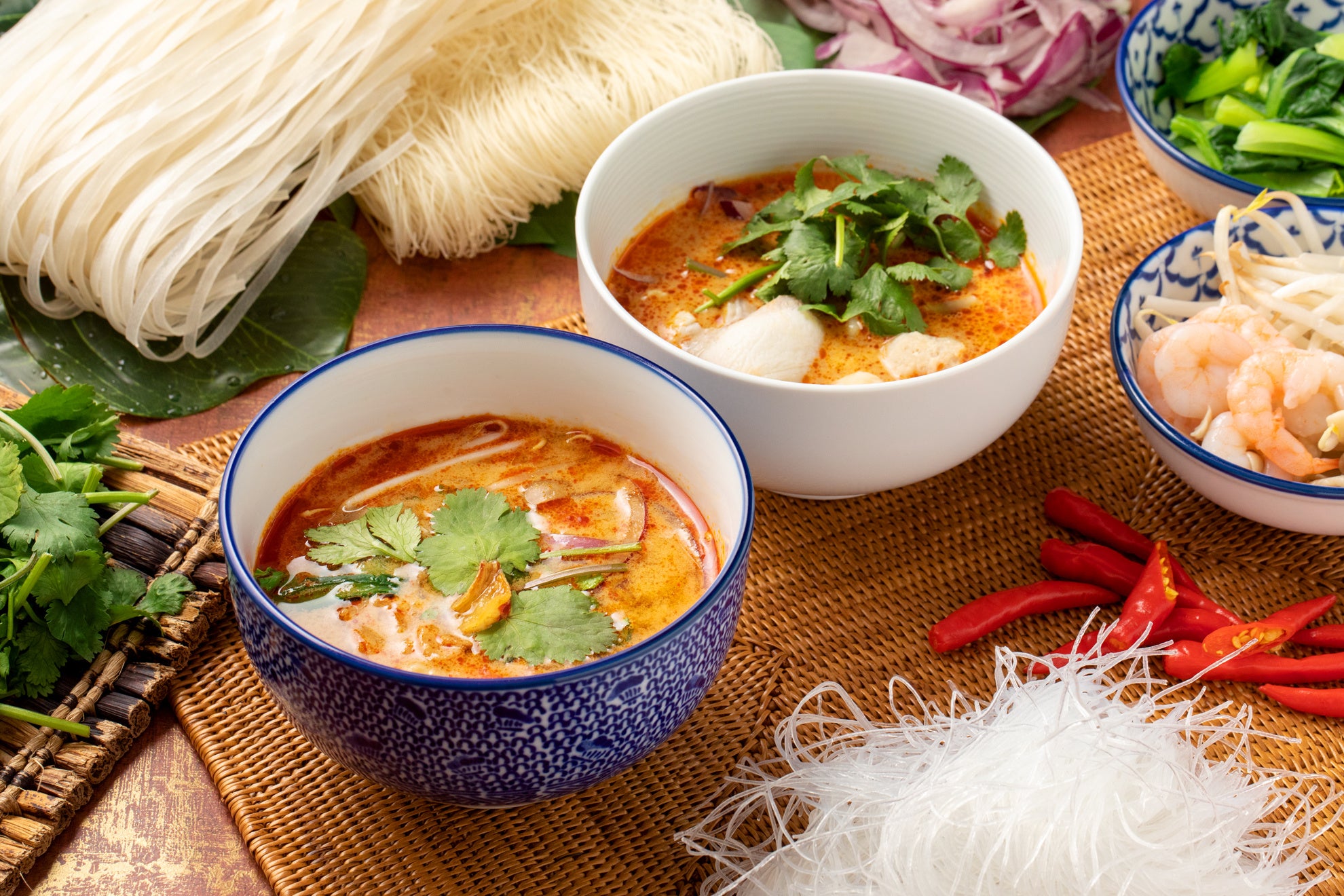 - 人気のタイスープと3種アジアンヌードルをお客様自身で調理、カスタマイズ!