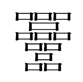 口の極限状態へ。「口」を三つ並べた「品」は我々にも身近な漢字だが、さらに極限まで推し進めて、十二個も積み重ねた漢字がこれである。意味は「おしゃべり」。このふざけた字は、江戸時代の戯作者である式亭三馬の『譃