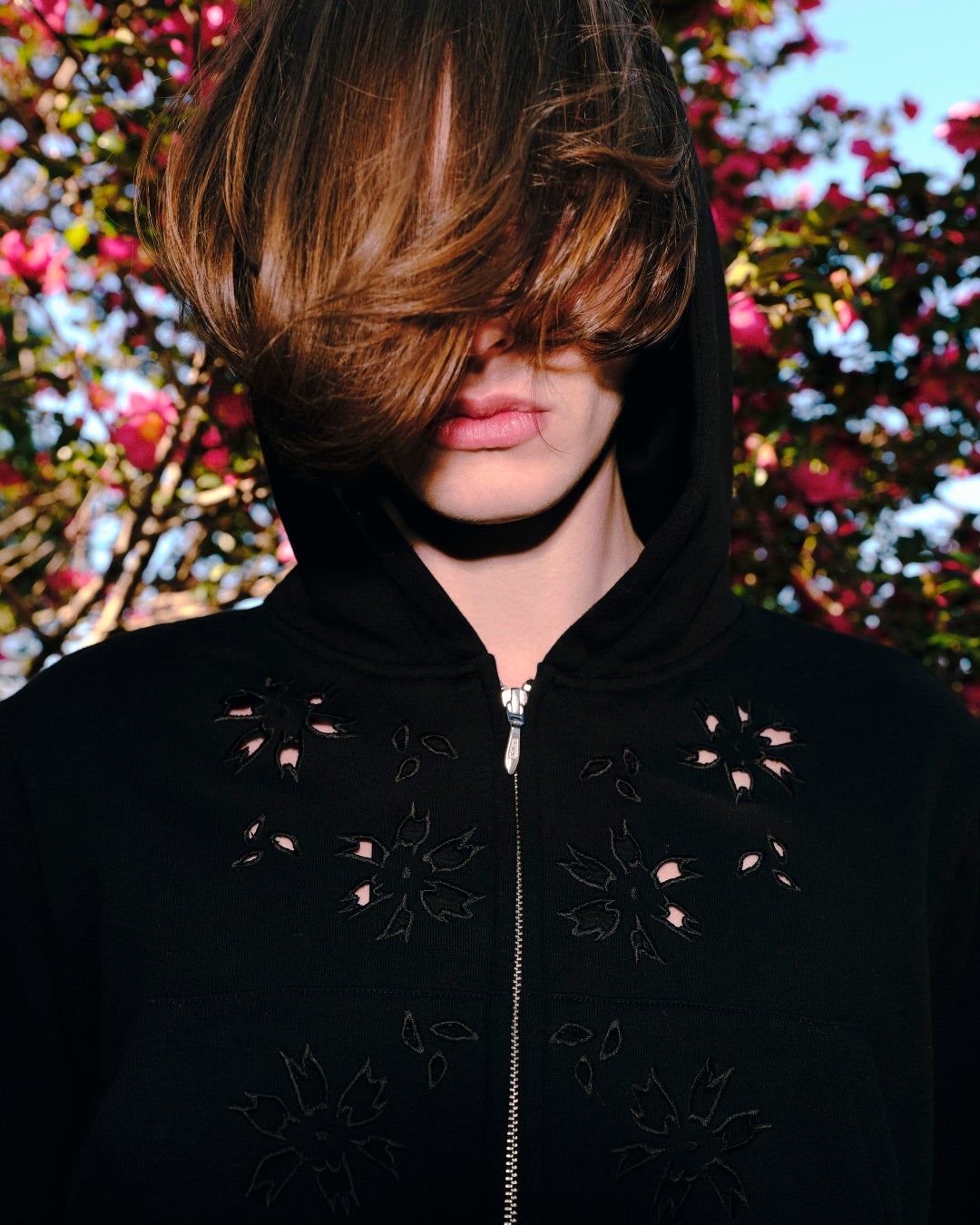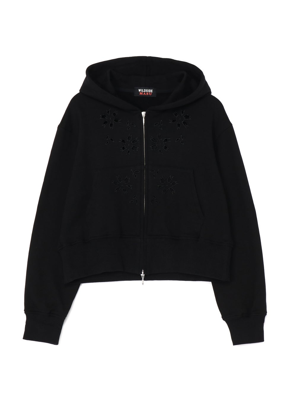 Yohji Yamamoto POUR HOMME 1996春夏コレクションで発表した繊細な花のカットワーク加工を、M A S Uのカジュアルなショート丈フーディに落とし込んだアイテム。生地には、何度も染めることで深い「黒」に仕上げたヨウジヤマモトの裏毛を採用。M A S Uのパターンに、ヨウジヤマモト社のデザインと生地を合わせた特別なアイテムとなっています。
