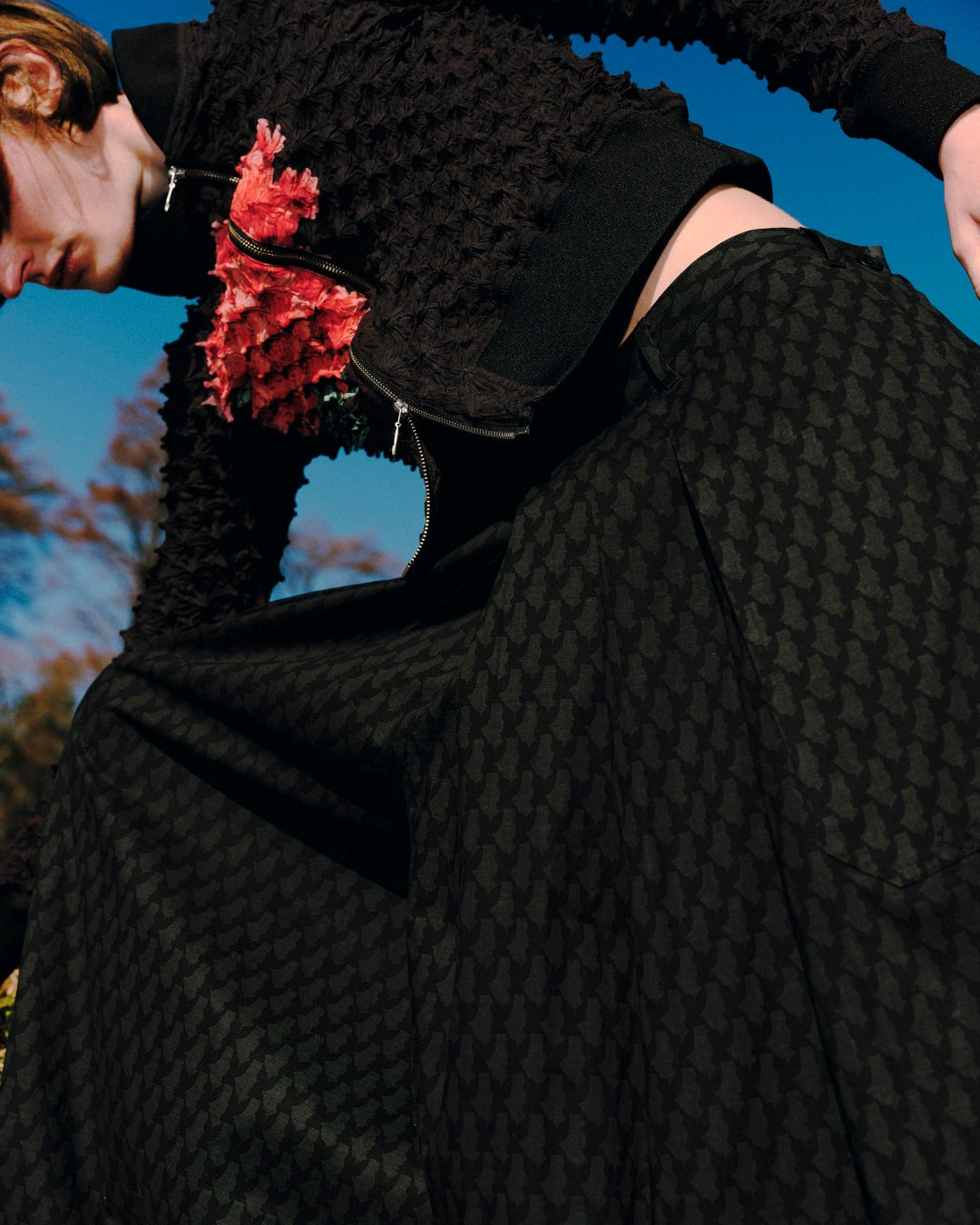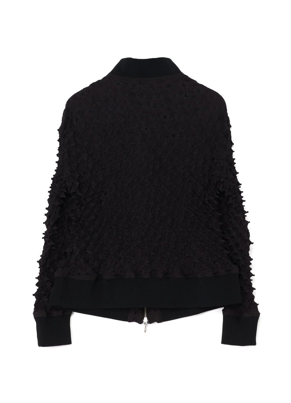 Yohji Yamamoto POUR HOMME で発売した牡丹の花が描かれたブルゾンを、M A S Uのシグネチャーアイテムでもあるスパイキーブルゾンへと再構築しました。大きくプリントされた牡丹の花は、伸縮性のあるポップコーン加工を施したミニマムな黒のボディの中で浮かび上がるように映り、インパクトを与えます。