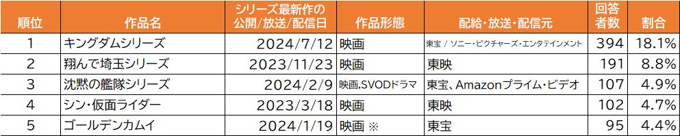 ※過去2年以内にシリーズ最新作が映画公開・テレビ放送・SVOD配信された漫画・アニメ実写作品のうち、最も観て良かった作品について回答を得たもの。なお、テレビドラマは全国地上波プライム帯(19~23時)で放送された作品を対象とした。