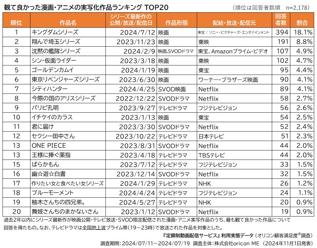 2024年 定額制動画配信サービス利用実態データ|視聴ジャンル「アニメ」最多57.0% "観て良かった漫画・アニメ実写作品ランキング"1位は『キングダム』 SVOD限定作品では『沈黙の艦隊』がトップに
