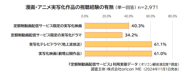 これまで映画やテレビドラマにおいて多くの漫画・アニメ原作の実写化作品が製作されてきましたが、近年では『定額制動画配信サービス(SVOD)』による漫画・アニメ原作の初実写化や独占配信作品が話題になることも少なくありません。そこで「定額制動画配信サービス限定の漫画・アニメ実写化作品」に関連する設問もあわせて聴取しました。