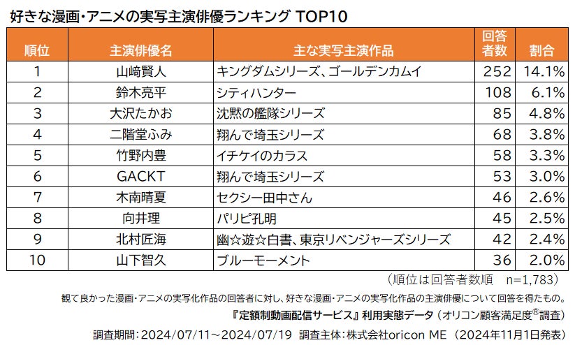 観て良かった漫画・アニメの実写化作品の回答者※に、“最も好きな漫画・アニメの実写主演俳優”について聴取したところ、【山﨑賢人】(主な主演作:キングダムシリーズ、ゴールデンカムイ)が2位と差をつけて首位を獲得しました。2位には、【鈴木亮平】(主な主演作:シティハンター)がランクイン。つづいて3位には、【大沢たかお】(主な主演作:沈黙の艦隊シリーズ)、4位には【二階堂ふみ】(主な主演作:翔んで埼玉シリーズ)が入り、女性の主演俳優のなかで1位を獲得しています。