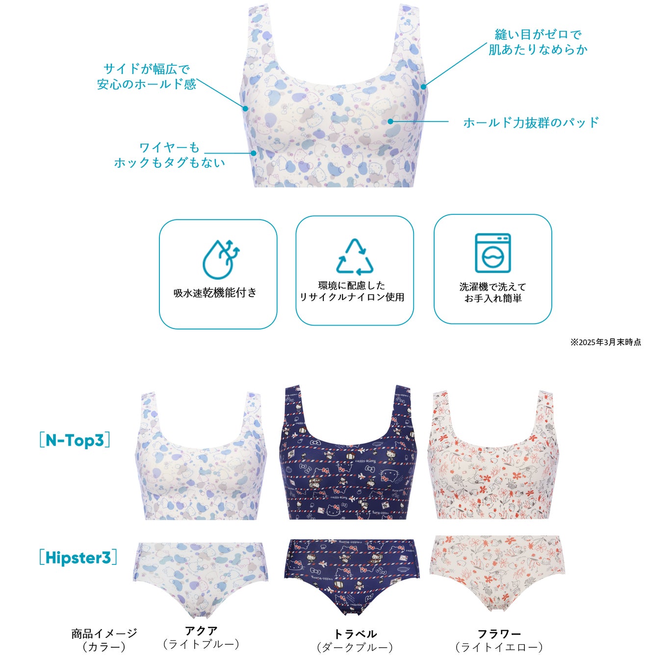 昨年ニットシリーズが大好評だったハローキティとのコラボレーションが今年も登場します。今回はスロギーのシグネチャーアイテム「ゼロフィールⓇ ベーシック」にスロギーオリジナルのハローキティのデザインを全面にプリント。アクア、トラベル、フラワーの3つの異なるテーマからお好きなパターンをお選びいただけます。生地は、夏の汗ばむ季節に嬉しい吸水速乾機能付き。サステナビリティにも配慮したリサイクルナイロン素材を使用しています。接着技術を使用した無縫製のブラ&ショーツで、アウターにひびきにくく、快適な着け心地です。