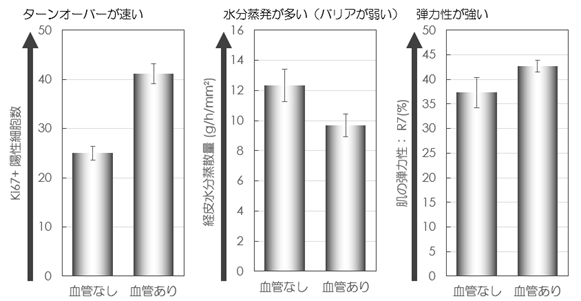 次に、血管の有無による人工皮膚の機能性を比較しました。その結果、肌の保湿バリア機能、透明感等に重要な役割を果たすターンオーバー機能、しわたるみに関わる肌の弾力性について、血管付与による改善が認められました(図3)。