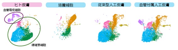 一般的な人工皮膚は、表皮角化細胞と真皮線維芽細胞の2種の細胞からなる、表皮と真皮の2層モデルです。まず研究チームは、表皮角化細胞、真皮線維芽細胞、臍帯由来血管内皮細胞の3種の細胞を用いて血管構造を持つ人工皮膚モデルを構築しました(図1)。次に、構築した人工皮膚に含まれる細胞を対象に単一細胞RNAシークエンス解析を実施し、真皮に含まれる細胞の性質と多様性を評価しました。生体ヒト皮膚の真皮には多様性のある線維芽細胞と血管周皮細胞が含まれますが、研究用にこれらの細胞を平面培養した細胞では多様性が喪失されていました。その一方で、構築された人工皮膚の線維芽細胞と血管周皮細胞の多様性分布パターンが生体ヒト皮膚と非常に類似したパターンであることが確認されました(図2)。この結果は、従来困難とされていた線維芽細胞と血管周皮細胞の細胞不均一性の再現には、三次元環境と血管と皮膚の細胞間相互作用が重要な役割を果たすことを示しています。