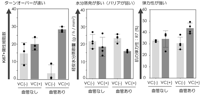 さらに、血管の有無による人工皮膚のビタミンCに対する反応性を比較しました。その結果、肌の保湿バリア機能、透明感等に重要な役割を果たすターンオーバー機能、しわたるみに関わる肌の弾力性について、血管付与によってビタミンCの有用性が増強されることが確認されました(図4)。