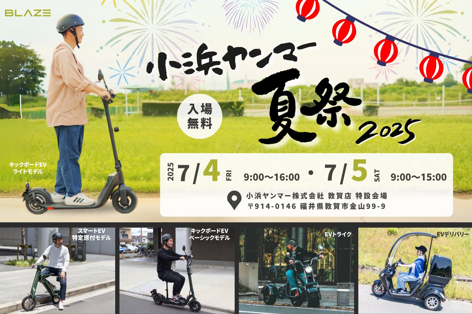 株式会社ブレイズ(本社:愛知県名古屋市、代表取締役:市川秀幸)は、2025年7月4日(金)・5日(土)に福井県敦賀市で開催される「小浜ヤンマー夏祭2025」に出展し、当社が展開する多彩な電動モビリティを展示・試乗提供いたします。