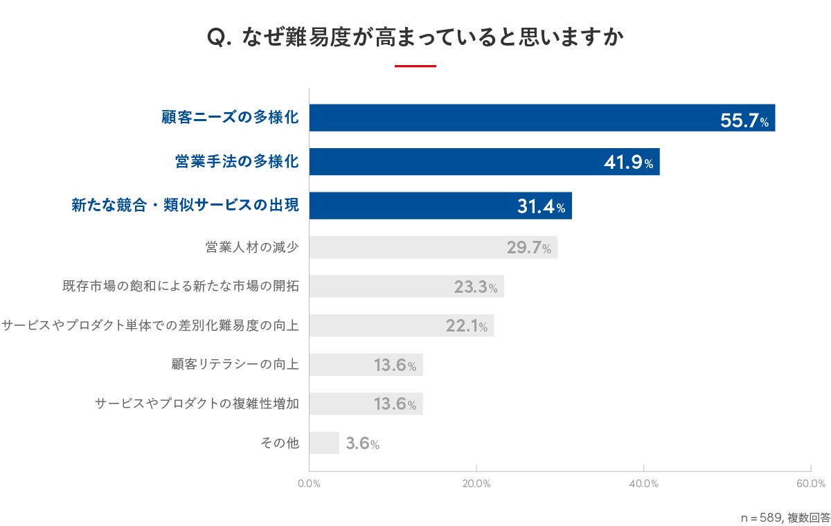 難易度が高まっていると回答した人にたいして、理由を聞いたところ「顧客ニーズの多様化」が55.7%、「営業手法の多様化」が41.9%、「新たな競合・類似サービスの出現」が31.4%という結果となりました。