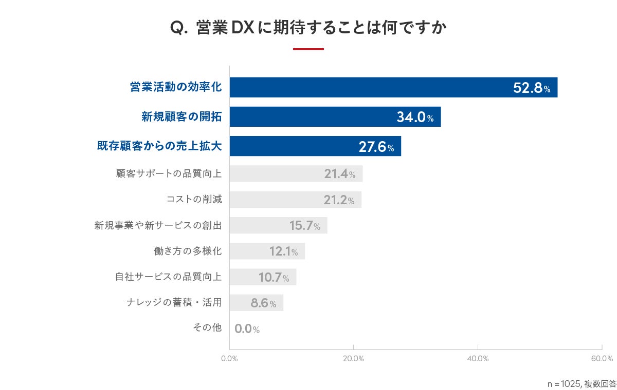 ・営業DXに期待していることTOP3は「営業活動の効率化」「新規顧客の開拓」「既存顧客からの売上拡大」
