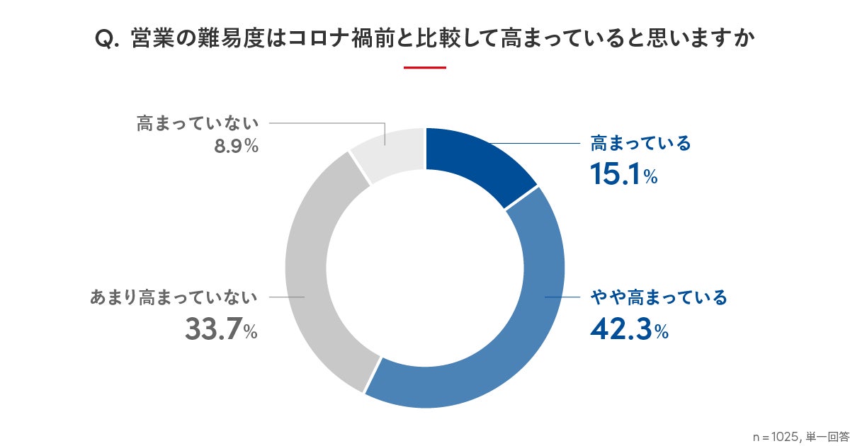 営業担当者1025名にコロナ禍前後で営業の難易度は高まっているか聞いたところ、「高まっている」または「やや高まっている」と回答した人は57.4%という結果でした。