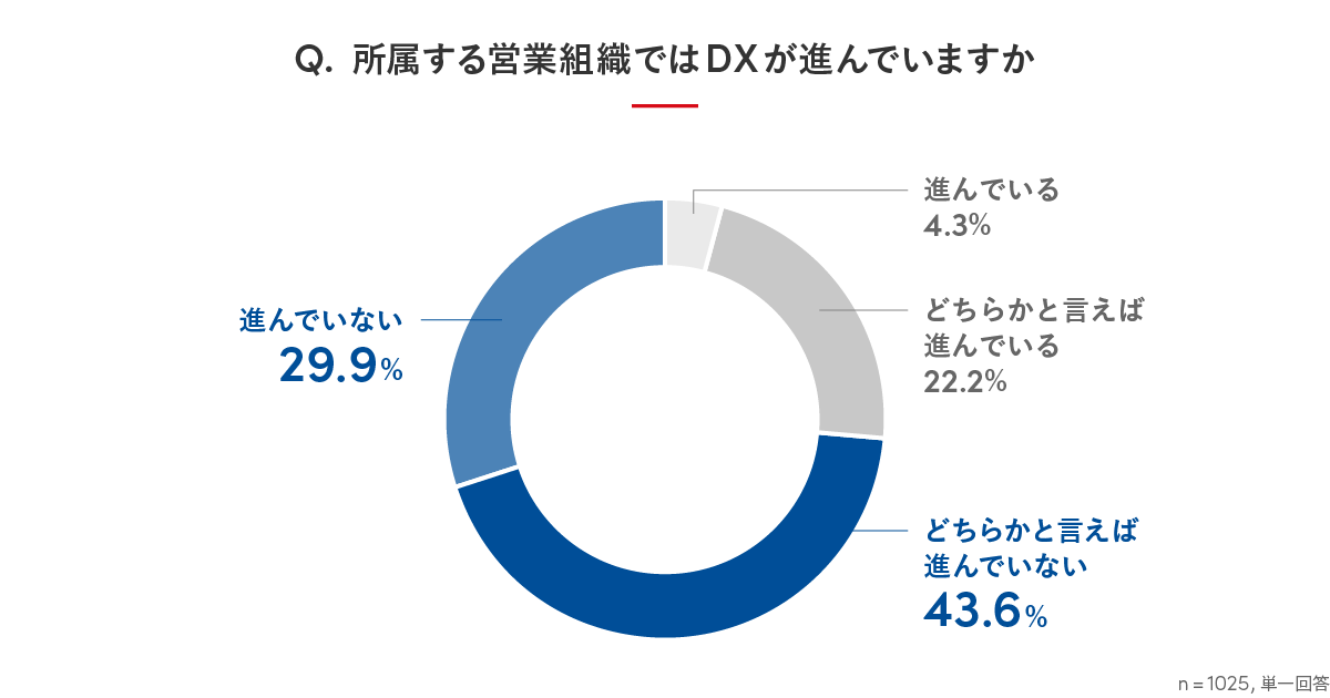 次に営業現場におけるDXの推進状況を明らかにするため、所属する組織では営業DXが進んでいるか聞いたところ、「進んでいない」または「どちらかと言えば進んでいない」と回答した人は73.5%という結果となりました。